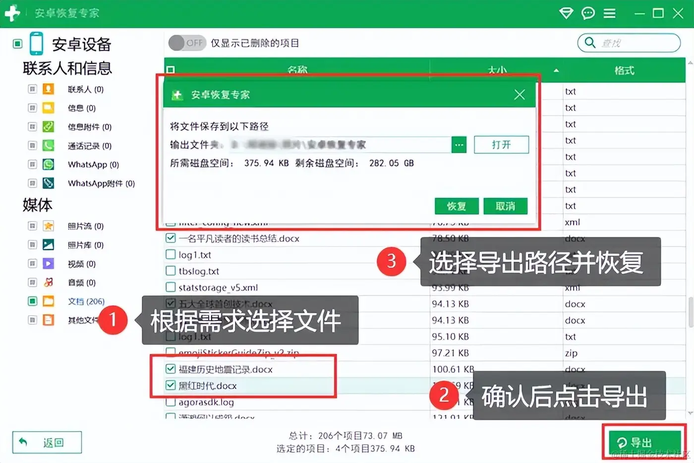 步骤3:扫描完成后,用户可以在界面中预览被删除的文件。通过仔细筛选和比较,选择想要恢复的文件,导出到指定文件夹。恢复完成之后,用户即可在该文件夹中查看确认文件。