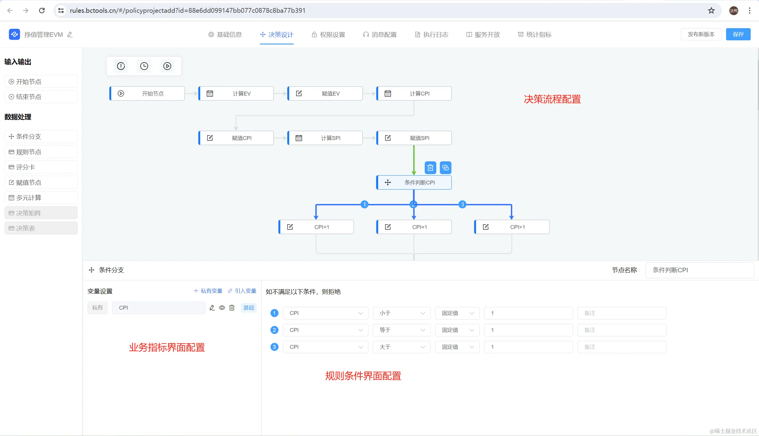 与声明式规则引擎不同,流程式规则引擎更注重规则执行顺序的可视化和流程管理。基于流程图的规则定义+业务判断指标界面加工的方式进行配置,使得用户可以直观地描述业务流程中的各个环节和规则之间的关系。典型产品如 jvs-rules,对用户操作非常友好