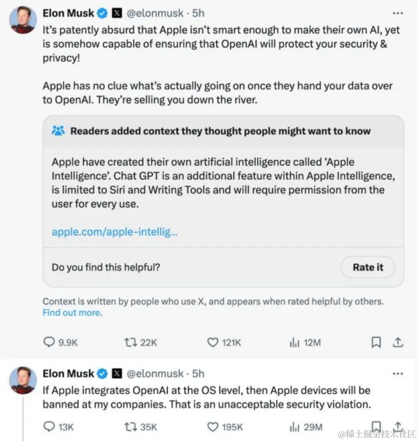 马斯克认为,苹果的这种做法是对用户隐私安全的不尊重,并表示,如果苹果在操作系统层面整合 OpenAI,那么苹果设备将被我的公司禁止使用。这是不可接受的安全违规行为。