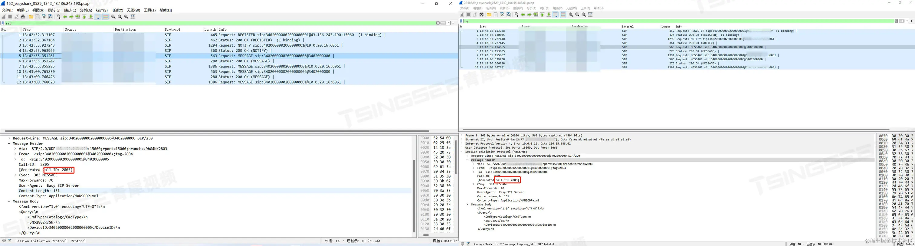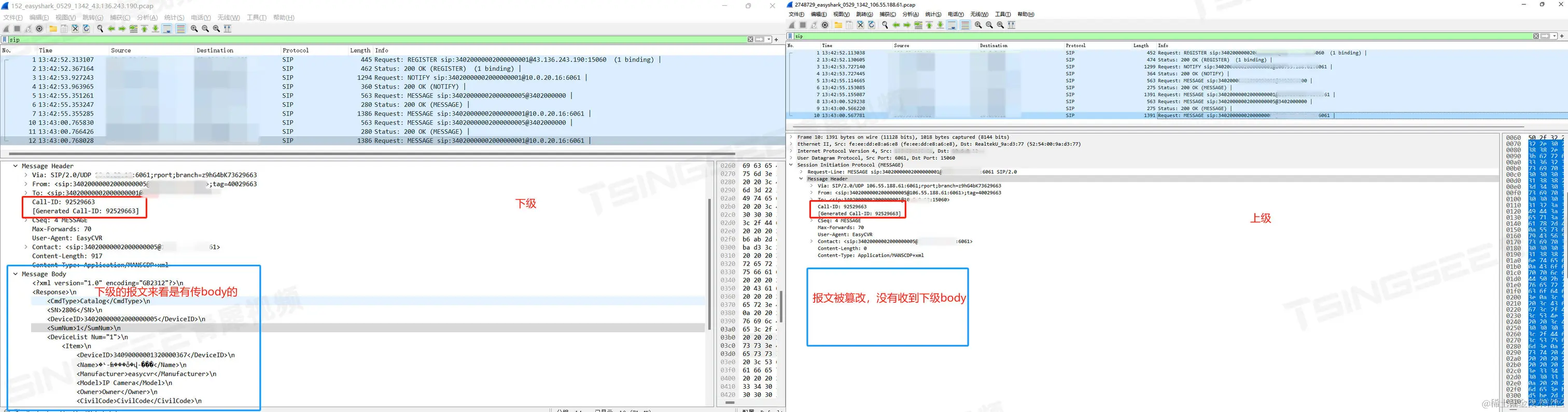 3)随后抓包查看,在上级服务器网卡抓包数据分析,上级在收到下级EasyCVR的报文被篡改,如下图所示: