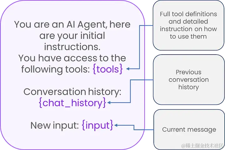 LangChain 的易用性或许会让我们不经意间忘却一个核心要点:不论我们的解决方案有多么繁琐,实质上所有组件都会汇总成一条长长的文本信息——“指令性提示词”——传递给LLM。接下来将要展示的内容是一个概括性的示例说明,用于展示 LLM Agent 在接收指令性提示词或执行任务前,其输入提示词的基本结构和主要组成部分。