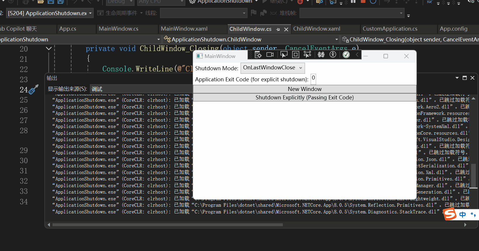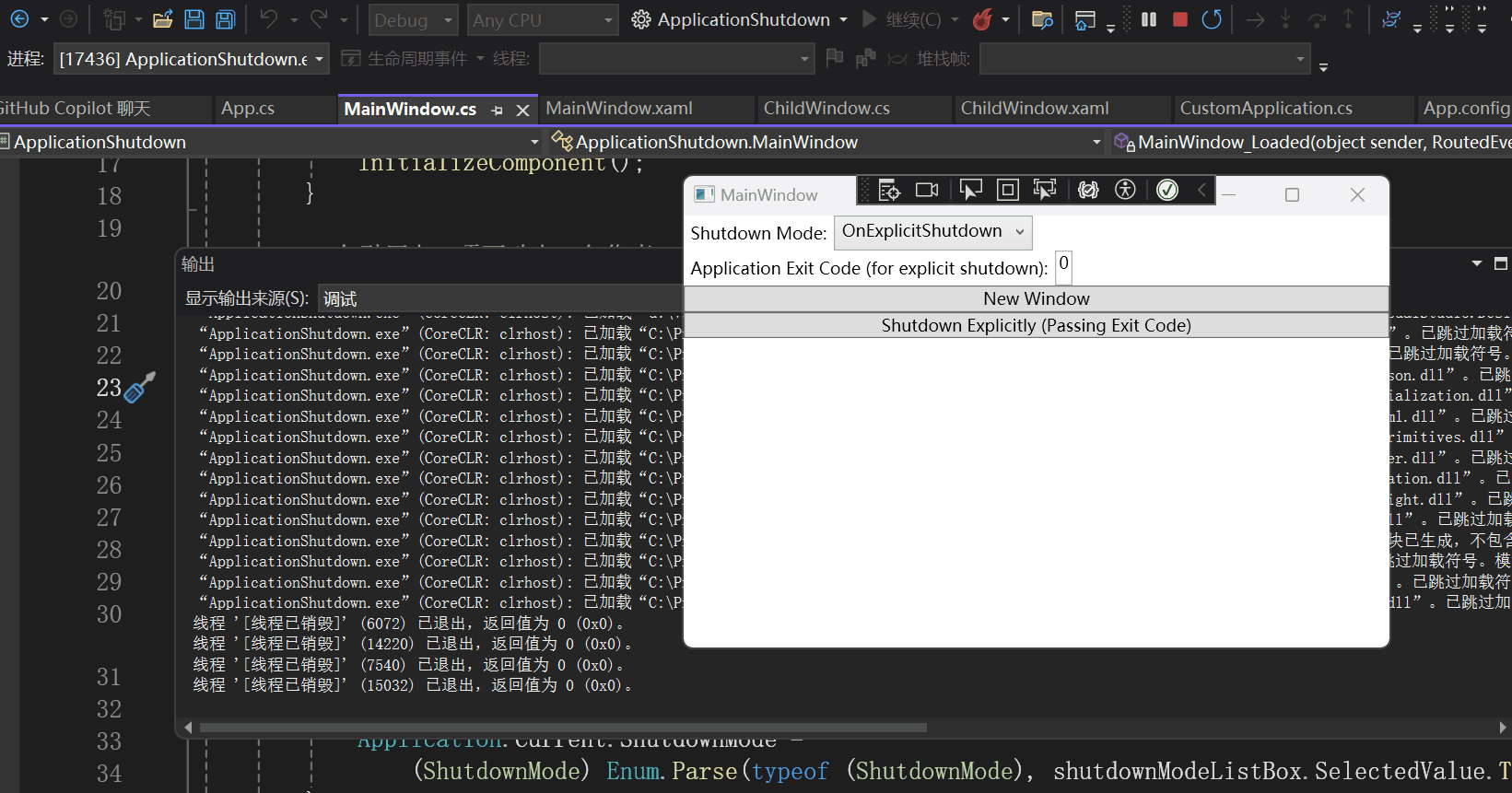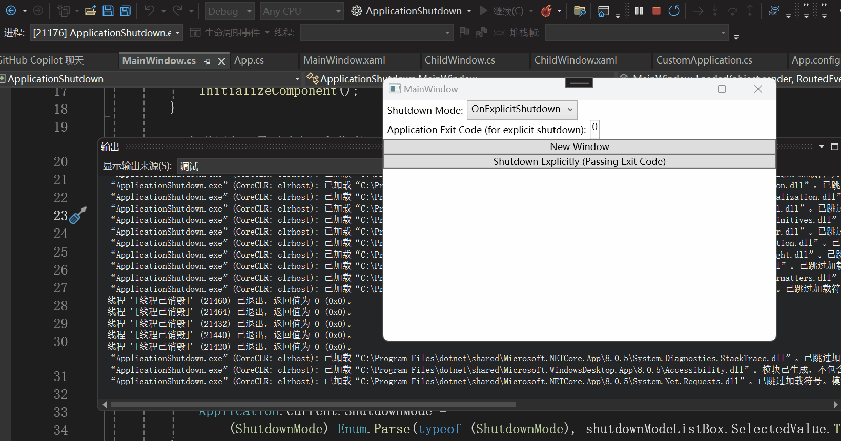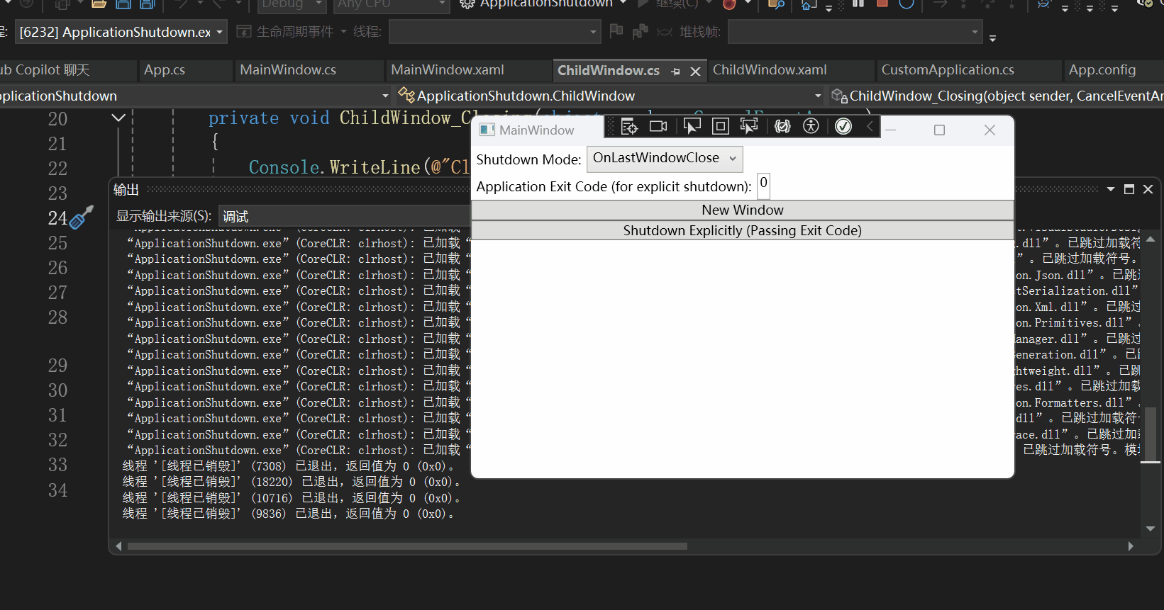 - OnLastWindowClose:当最后一个窗口关闭或者调用System.Windows.Application.Shutdown方法时,应用程序会关闭。