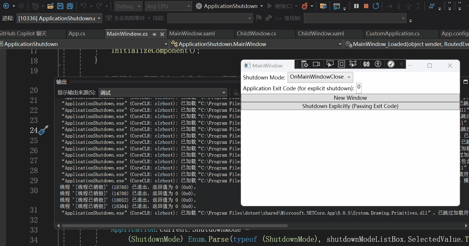 - OnMainWindowClose:当主窗口关闭或者调用System.Windows.Application.Shutdown方法时,应用程序会关闭。