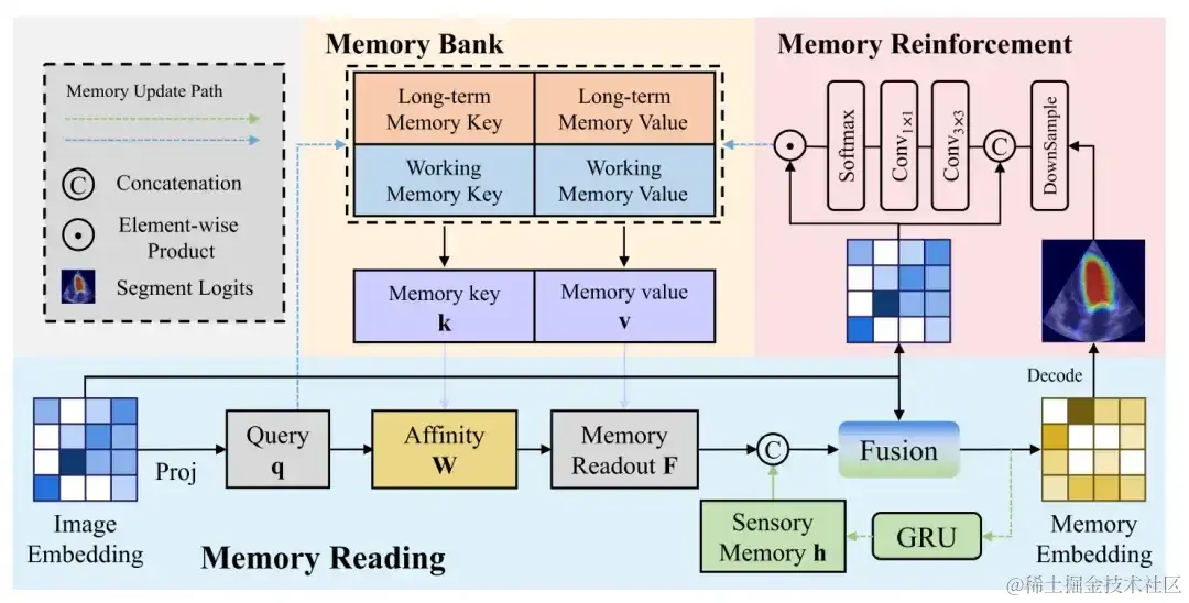 记忆读取块展示了从图像向量生成记忆向量的过程。图像向量通过投影生成查询 (Query),随后针对记忆值亲和力 (Affinity) 查询得到记忆读出,最后记忆读出将与感觉记忆 (Sensory Memory) 和图像向量融合得到记忆向量。