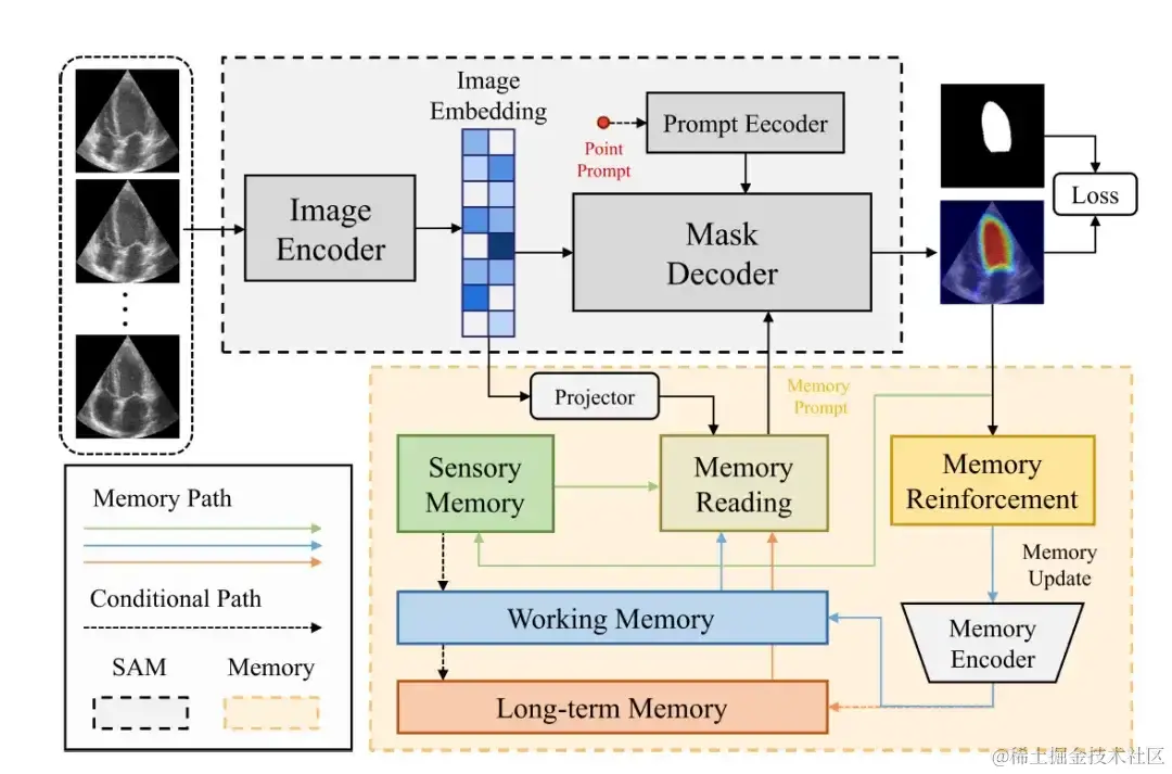 在这些组件中,图像向量通过投影层 (projection layer) 映射到记忆特征空间,然后研究人员进行记忆读取 (Memory Reading),从多重特征记忆(如感觉记忆 Sensory Memory、工作记忆 Working Memory 和长期记忆 Long-term Memory)中获得记忆提示 (Memory Prompt),并将其提供给掩码解码器。最后,通过记忆增强 (Memory Reinforcement) 和记忆编码器 (Memory Encoder) 后,记忆将被更新。