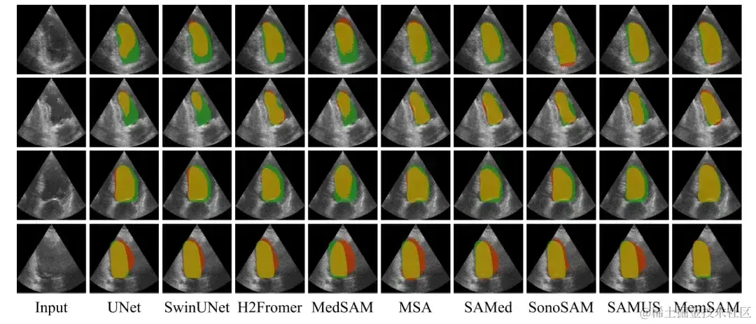 在 CAMUS-Semi 测试集上与最先进方法的直观对比 绿色、红色和黄色区域分别代表有效区域、预测和重叠区域