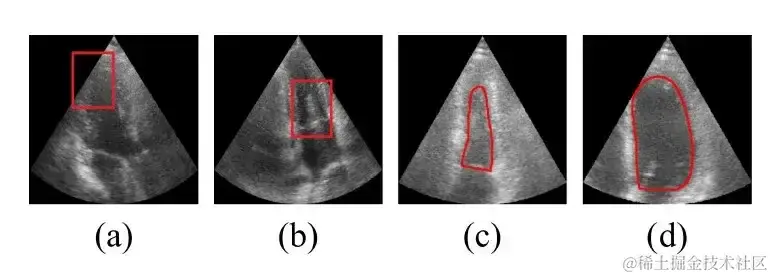 超声心动图视频评估的挑战(a) 轮廓模糊,(b) 斑点噪声,(c-d) 跨帧尺度变化