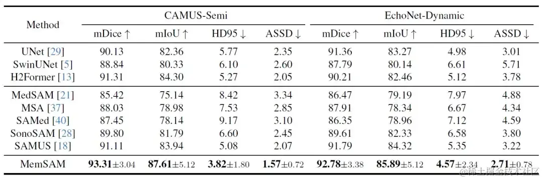 研究人员在 2 个广泛使用的公开可用的超声心动图数据集 CAMUS 和 EchoNet-Dynamic 上评估了其方法: