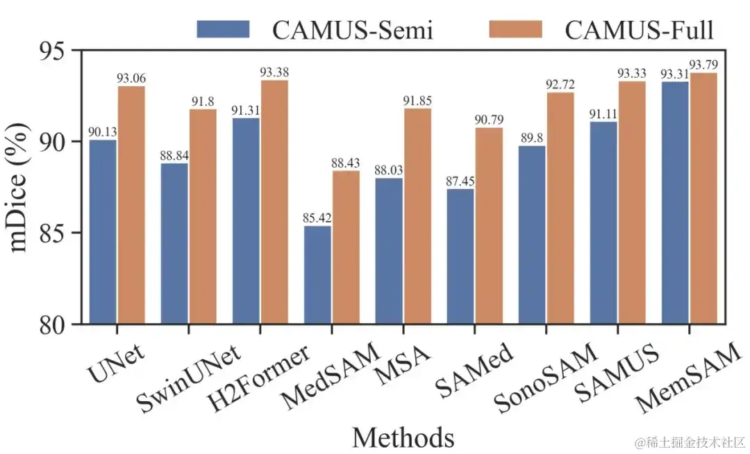 为了进一步评估 MemSAM,研究人员还在相同设置下对 CAMUS-Semi 和 CAMUS-Full 数据集进行了比较。结果如下图所示: