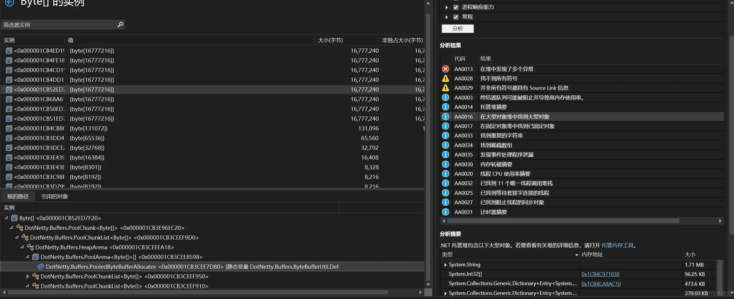 对于客户反应后,告诉客户把dump发过来,然后通过dump分析发现是DotNetty.Buffers.PooledByteBufferAllocator ``分配堆内存未进行释放