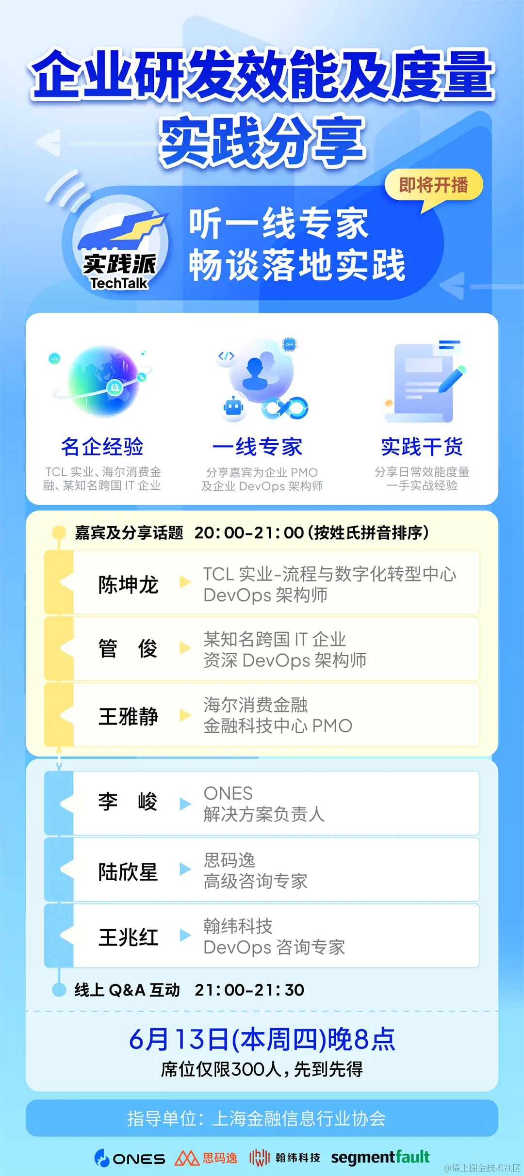 6月13日(明天)晚8点,ONES 联合上海金融信息行业协会、思码逸、翰纬科技、思否 Segmentfault 共同策划线上直播《企业研发效能及度量实践分享》,特邀来自TCL、海尔消费金融、某知名跨国 IT 企业的多位一线专家,从平台、指标到组织,深入探讨「研发效能度量」的场景案例、实战技巧和独家见解。