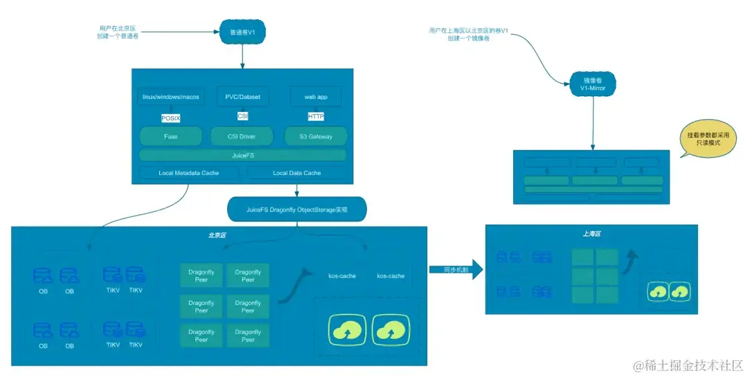当进行跨区数据复制时,用户首先在北京区创建一个数据集(JuiceFS 卷),这个数据集本质上是一个可在北京区挂载的 JuiceFS 卷,其底层将自动完成卷的初始化。随后,用户需要执行第二步操作,即在上海区创建一个镜像文件系统,并确保该文件系统与北京区的卷进行关联。