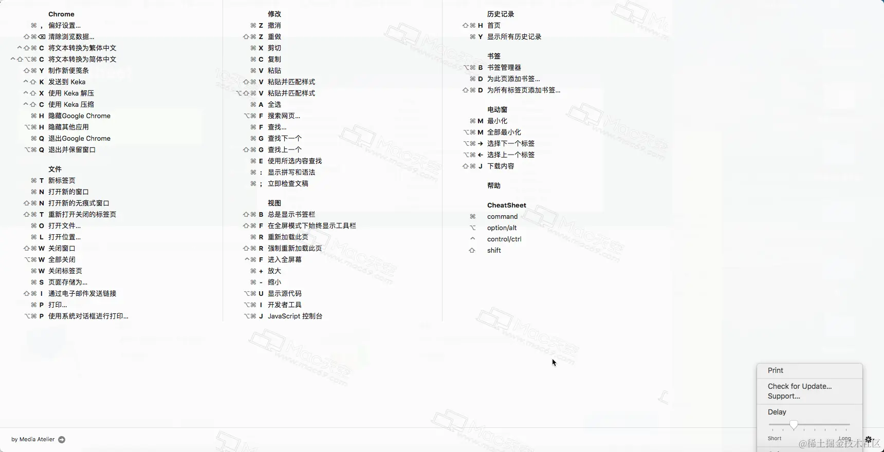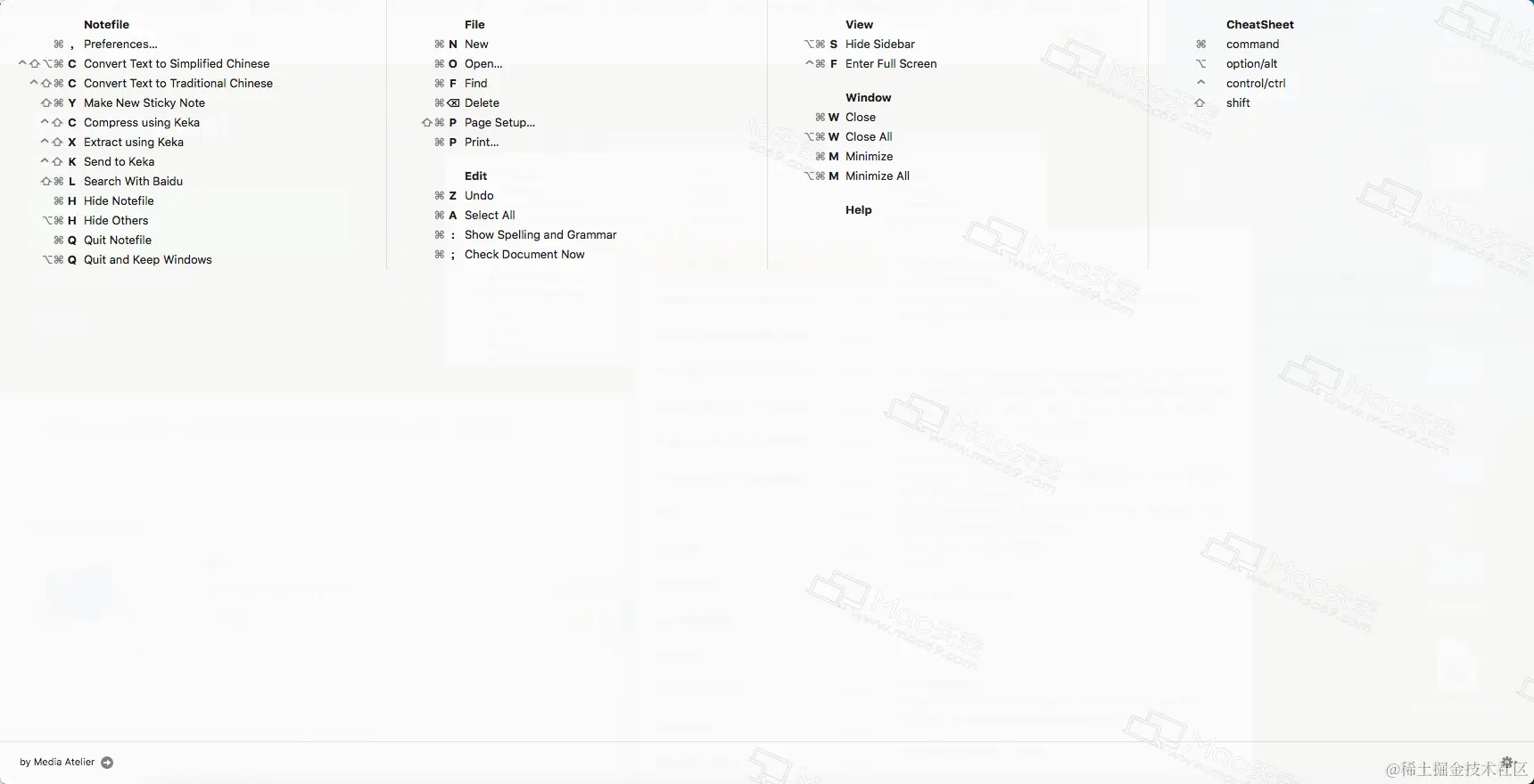CheatSheet for Mac是专门用来查看应用程序快捷键的工具,安装好cheatsheet软件后,在软件界面长按Command键即可快速查看快捷键列表,非常的便捷,想要了解更多关于软件的快捷键,那就赶紧试试cheatsheet for mac吧! 复制到浏览器打开:www.mac69.com/mac/2296.ht…