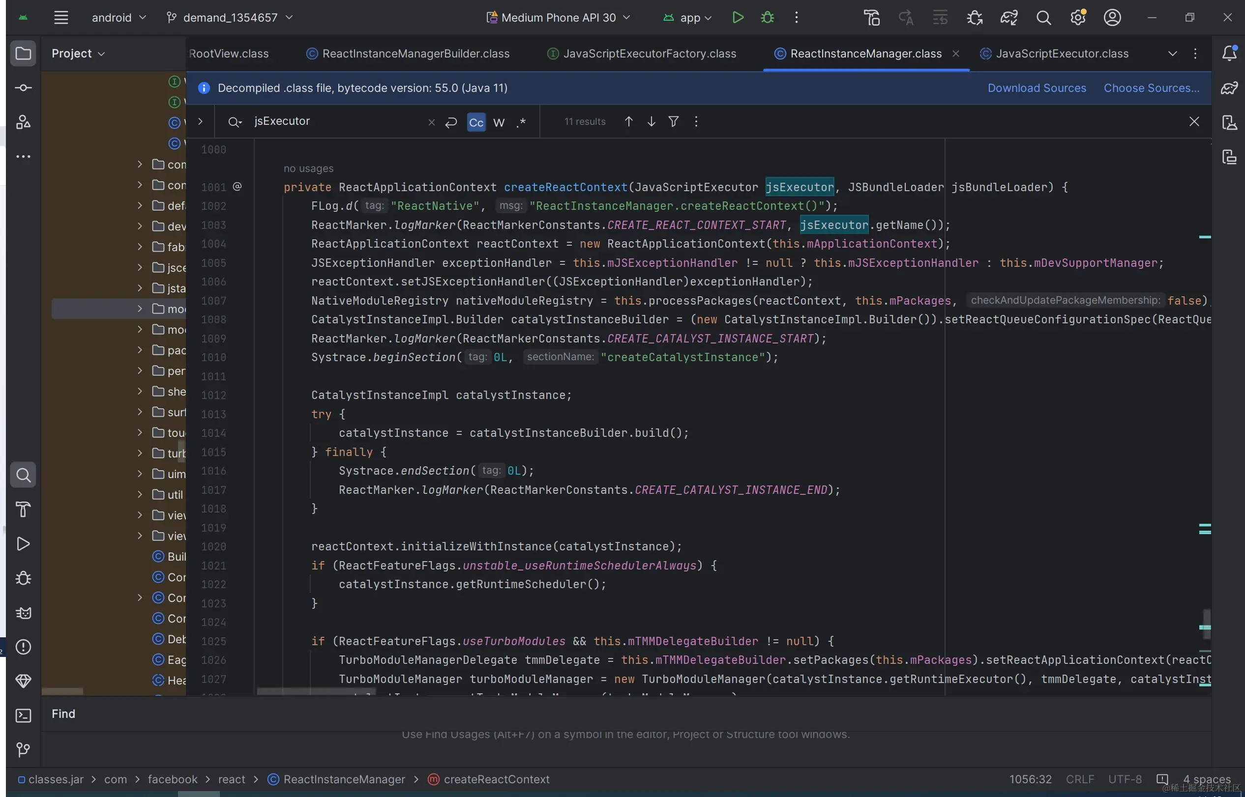 - 在jsExecutor创建过程中(JavaScriptExecutorFactory实例化)会依赖于已经加载的 SO 库来执行其功能,并且,在初始jsExecutor时会调用initialze去初始C++层ReactNative与JSC的通信框架等。