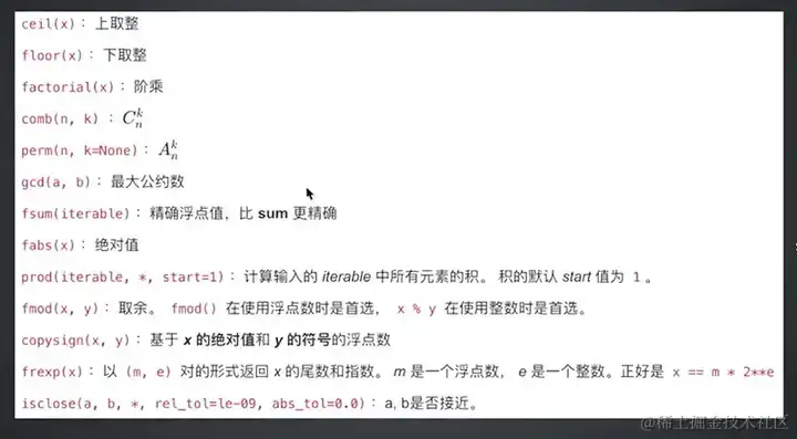 - python 提供的内置数学类函数库,包含了很多数学公式,比如幂函数运算,三角函数,高等函数运算等