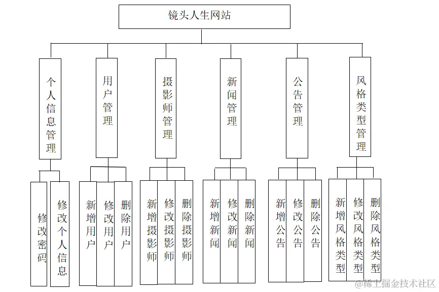 在分析并得出使用者对程序的功能要求时,就可以进行程序设计了。如图4.2展示的就是管理员功能结构图,管理员主要负责填摄影师和其类别信息,并对已填充的数据进行维护,包括修改与删除,管理员也需要对公告,新闻,用户和基础数据等进行管理。