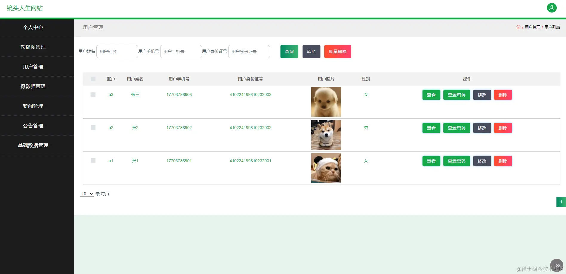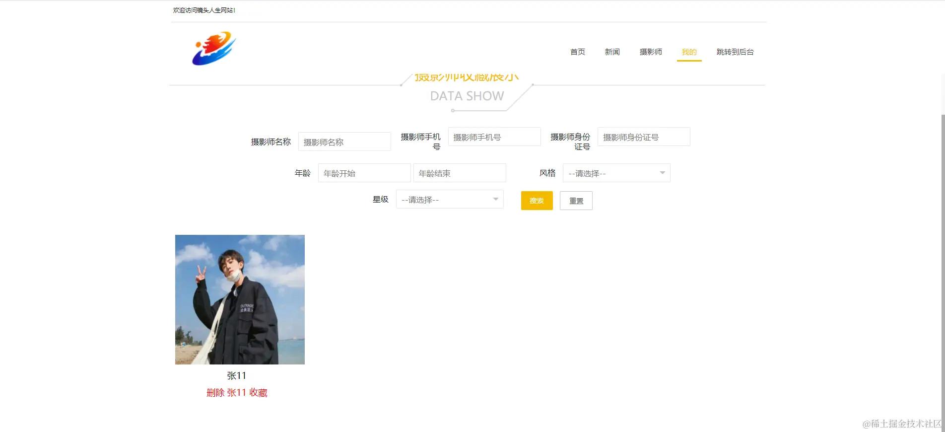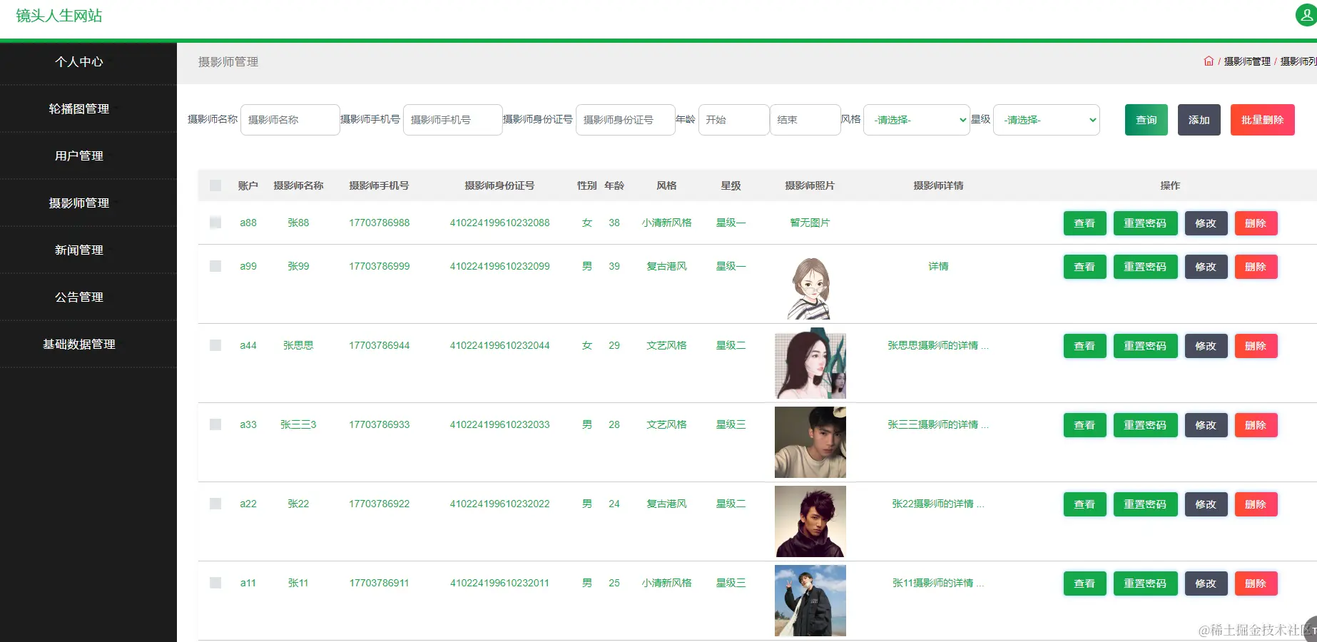 如图5.3显示的就是摄影师管理页面,此页面提供给管理员的功能有:新增摄影师,修改摄影师,删除摄影师。