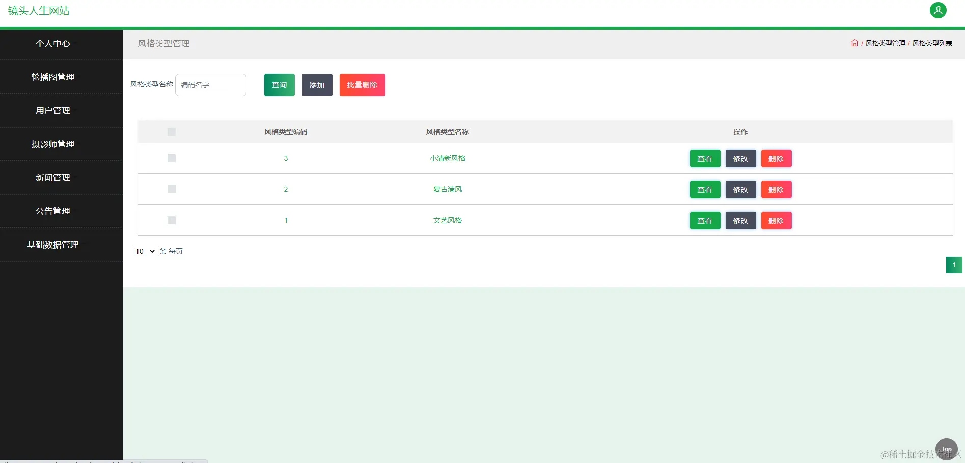 如图5.4显示的就是风格类型管理页面,此页面提供给管理员的功能有:新增类型,修改风格类型,删除风格类型。