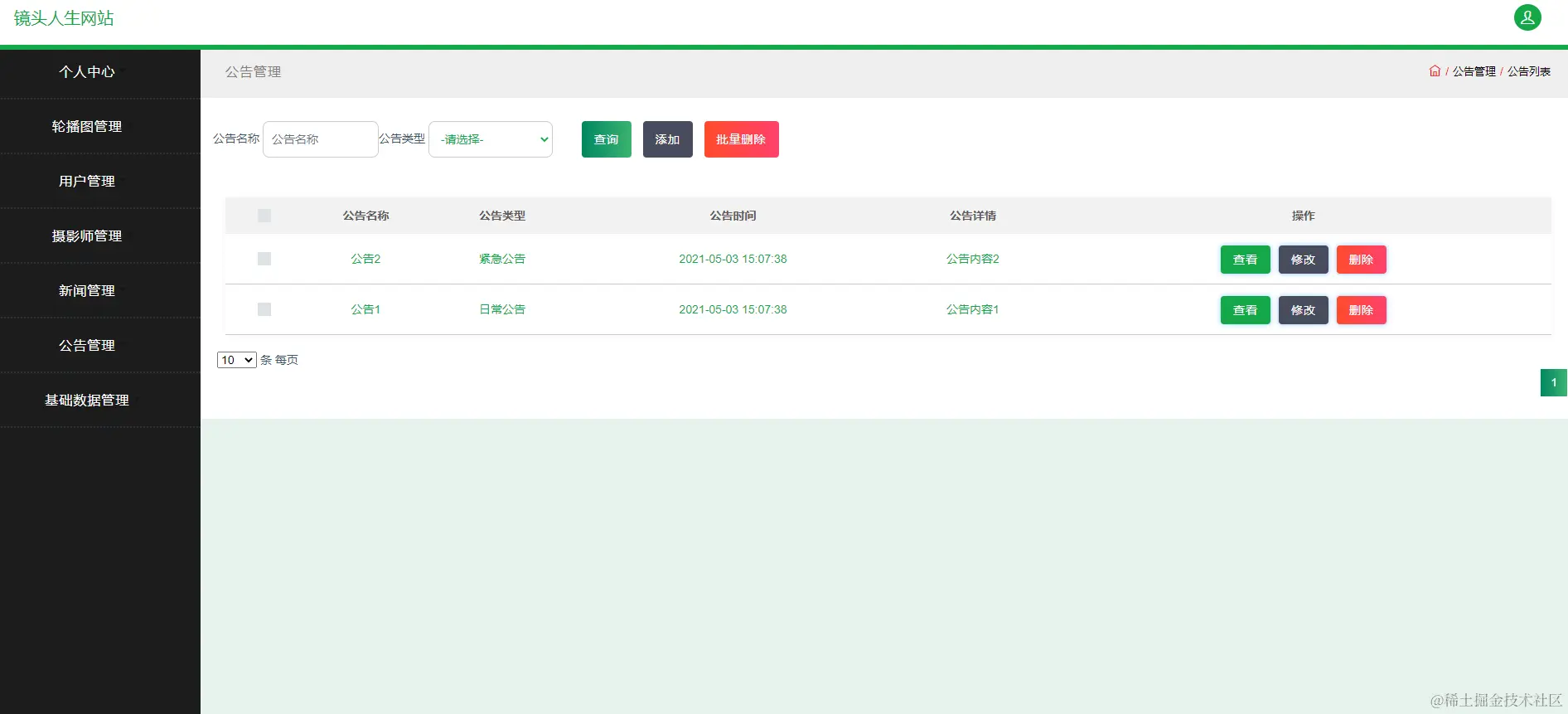 如图5.2显示的就是公告管理页面,此页面提供给管理员的功能有:新增公告,删除公告,修改公告。