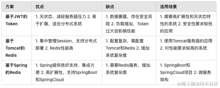 分布式Session的实现方案有很多种,本文主要介绍了基于JWT的Token、基于Tomcat的Redis以及基于Spring的Redis三种方案。每种方案都有其优缺点,选择哪种方案需要根据具体的业务场景和需求来决定。希望本文能对大家有所帮助,如果你有更好的实现方案,欢迎在评论区分享哦!