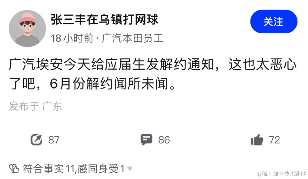 六月份被通知违约,首先校招着落没了;有部分同学甚至是放弃了其他机会选的埃安 Offer;可能还有相当一部分同学连「应届生」的身份都要失效了。