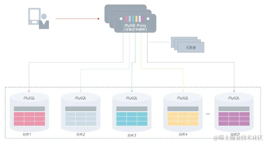 另一种比较流行的分布式数据库访问方式是通过分布式数据库中间件。数据库中间件本身模拟成一个 MySQL 数据库,通信协议也都遵循 MySQL 协议:业务之前怎么访问MySQL数据库的,就如何访问MySQL分布式数据库中间件。