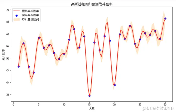 - 预测战斗胜率:红色曲线表示高斯过程回归模型对战斗胜率的预测值。这条曲线平滑地通过数据点,并尽量接近实际观测值,显示了模型对数据的拟合能力。
