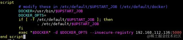 注:因为Docker从1.3.X之后,与docker registry交互默认使用的是https,然而此处搭建的私有仓库只提供http服务,所以当与私有仓库交互时就会报上面的错误。为了解决这个问题需要在启动docker server时增加启动参数为默认使用http访问。修改docker启动配置文件(此处是修改客户机器的配置)Ubuntu下配置文件地址为:/etc/init/docker.conf,在其中增加–insecure-registry 192.168.8.2:5000如下所示: