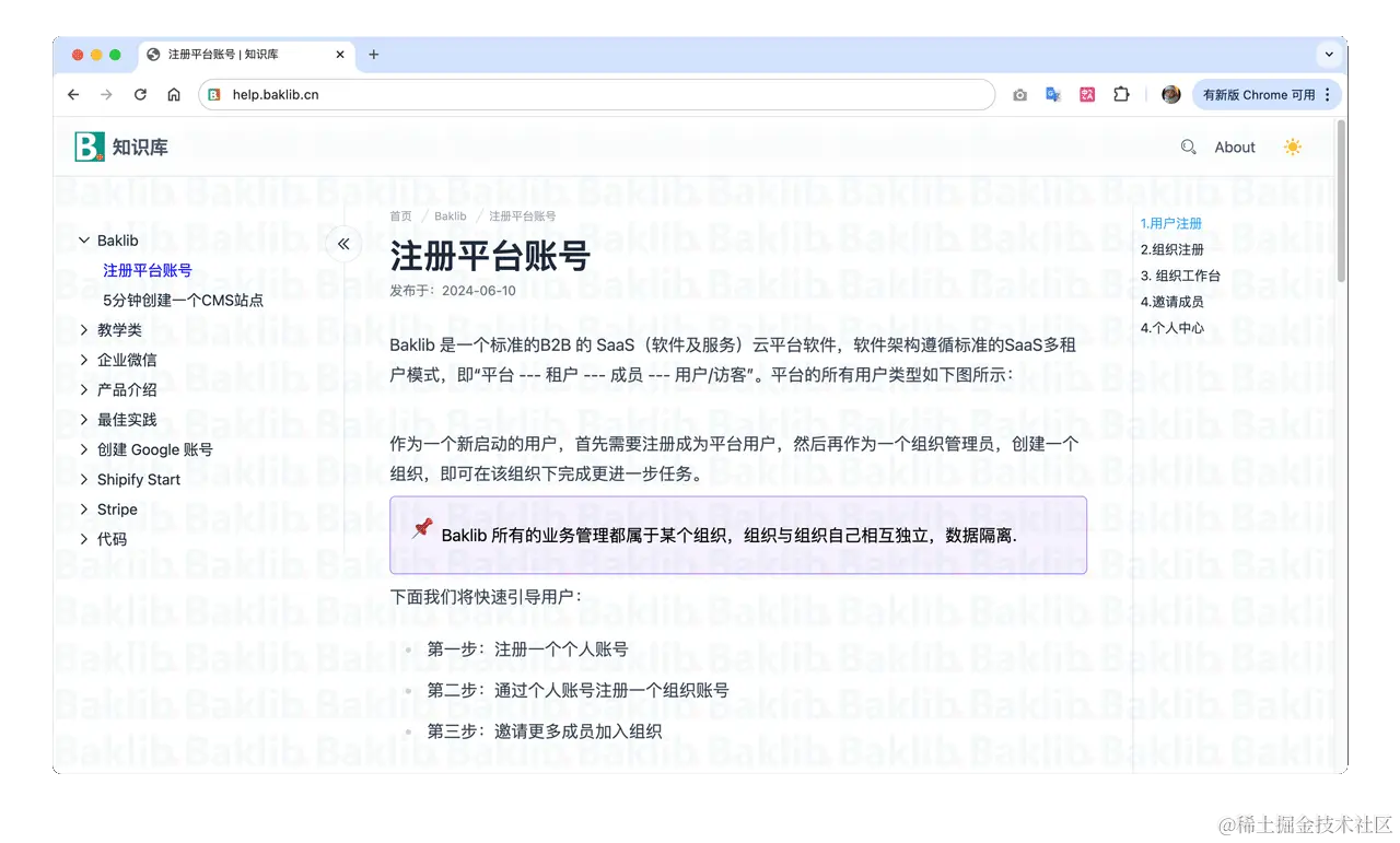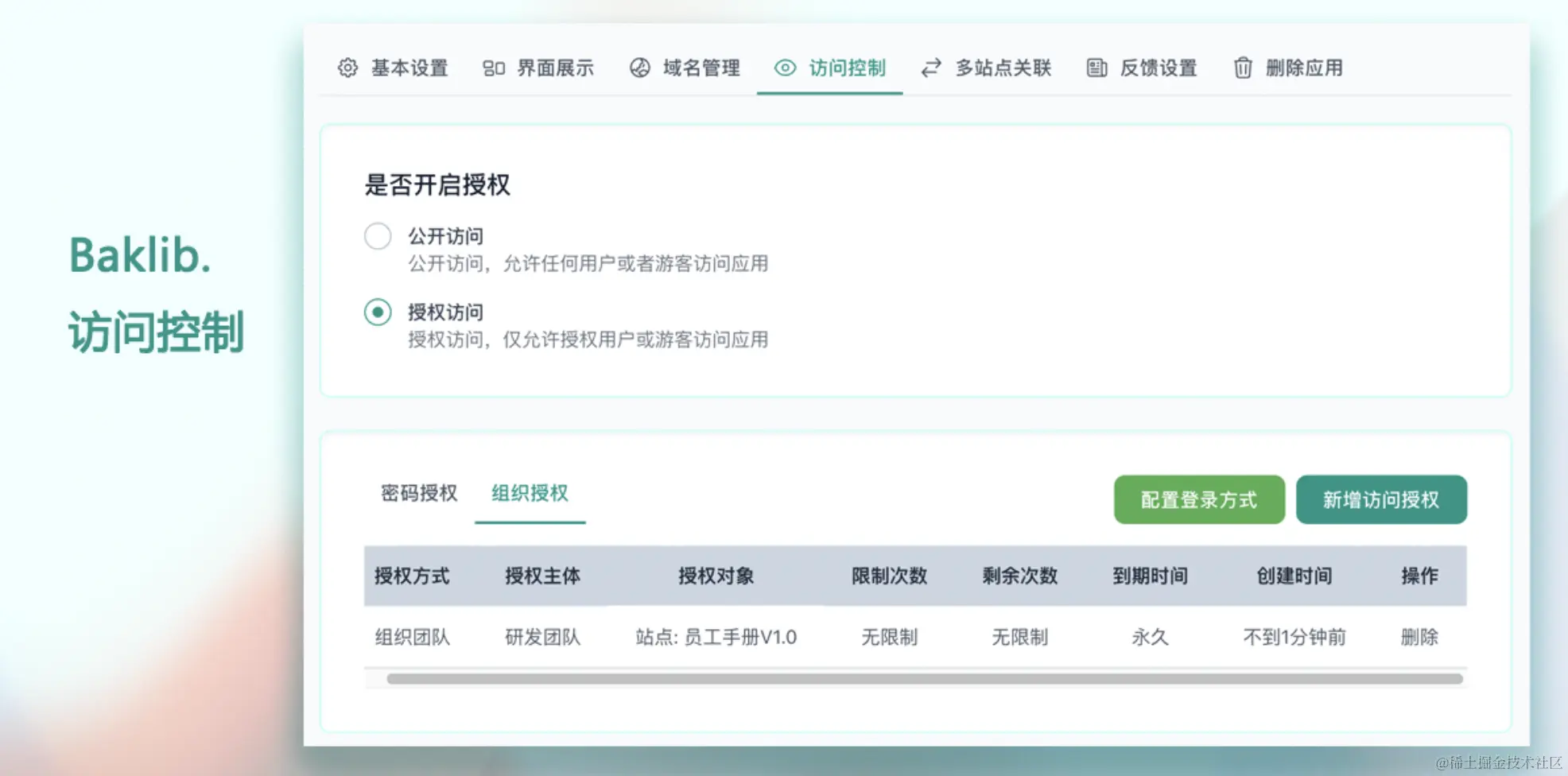 在Baklib中的创建的站点,可设置加密授权访问、组织授权访问,了解更多:功能特性之访问控制。