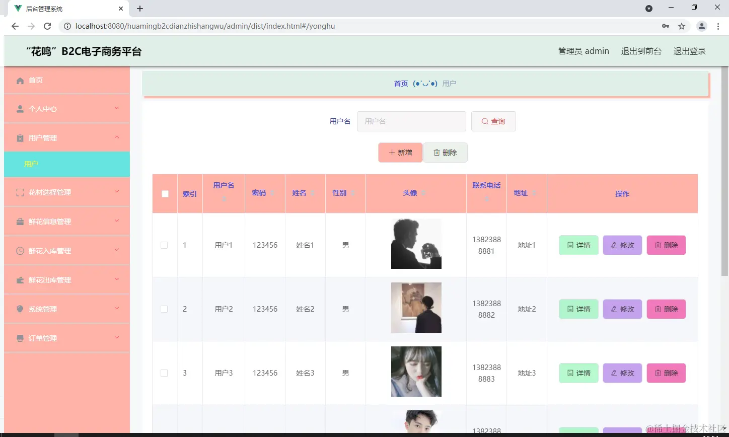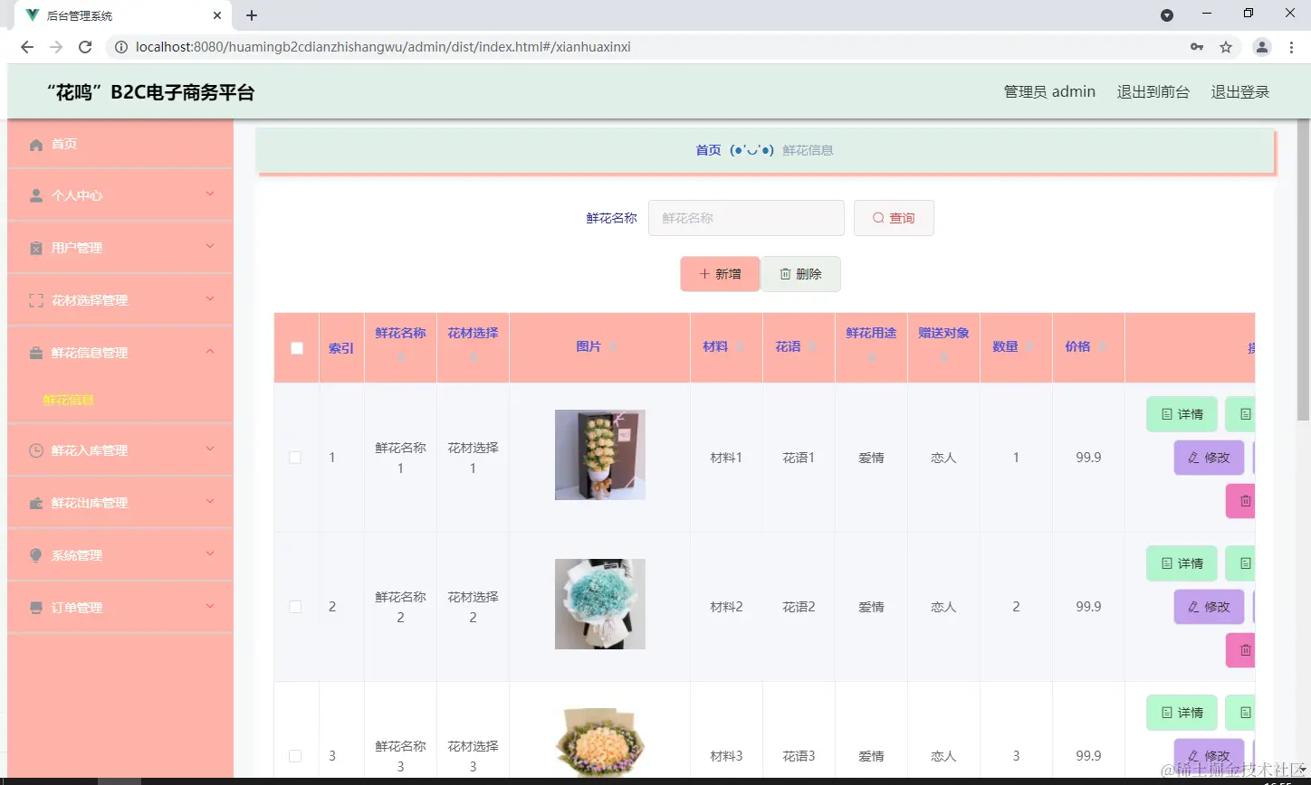 如图5.3显示的就是鲜花信息管理页面,此页面提供给管理员的功能有:根据鲜花信息进行条件查询,还可以对鲜花信息进行新增、修改、查询操作等等。