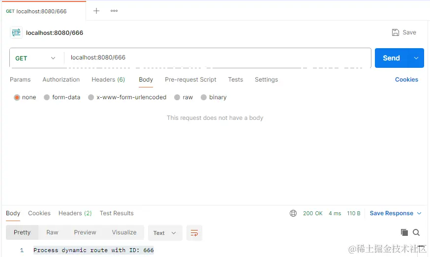 我们仍使用Postman来模拟浏览器的动态路由参数,方法选择GET,路径为localhost:8080/666,Body选择none。点击Send按钮,我们会收到Rust Web Server返回的GET响应,Body为:Process dynamic route with ID: 666。