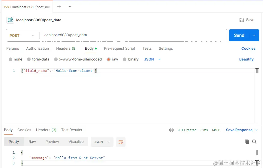 在命令行中运行cargo run来启动程序,此时服务器开始监听localhost:8080。我们可以使用Postman来模拟浏览器发送POST请求的行为,方法选择POST,路径为localhost:8080/post_data,Body选择raw/JSON,输入:{"field_name": "Hello from client"}。点击Send按钮,我们会收到Rust Web Server返回的POST响应,Body为:{"message": "Hello from Rust Server"}。