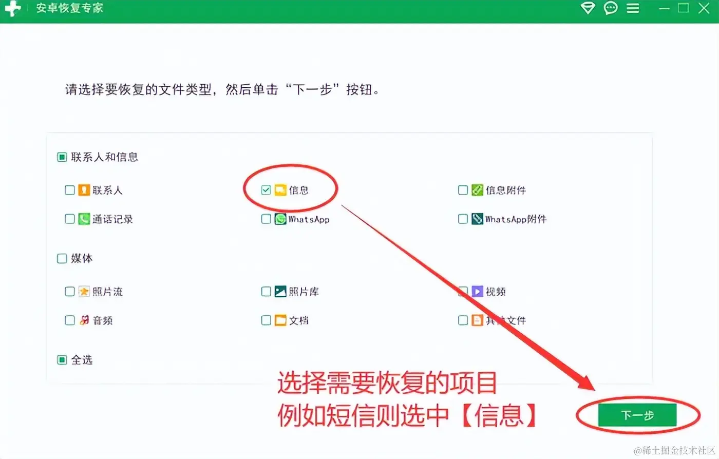 第二步:选择需要恢复的数据类型。在界面上根据自身需求选择恢复对象,如照片、视频、联系人等。也可以全部选择,对手机数据全面扫描,不过这可能需要一定的时间。比如小编选择恢复短信,则需要点击 【信息】 。