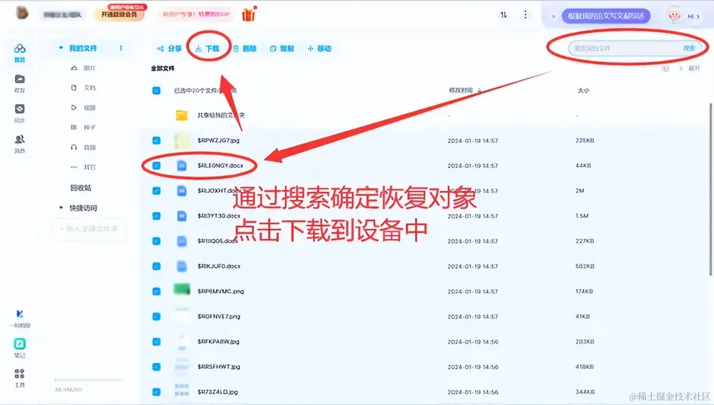 第二步:通过搜索或浏览,找到需要恢复的数据,选中并点击下载即可。