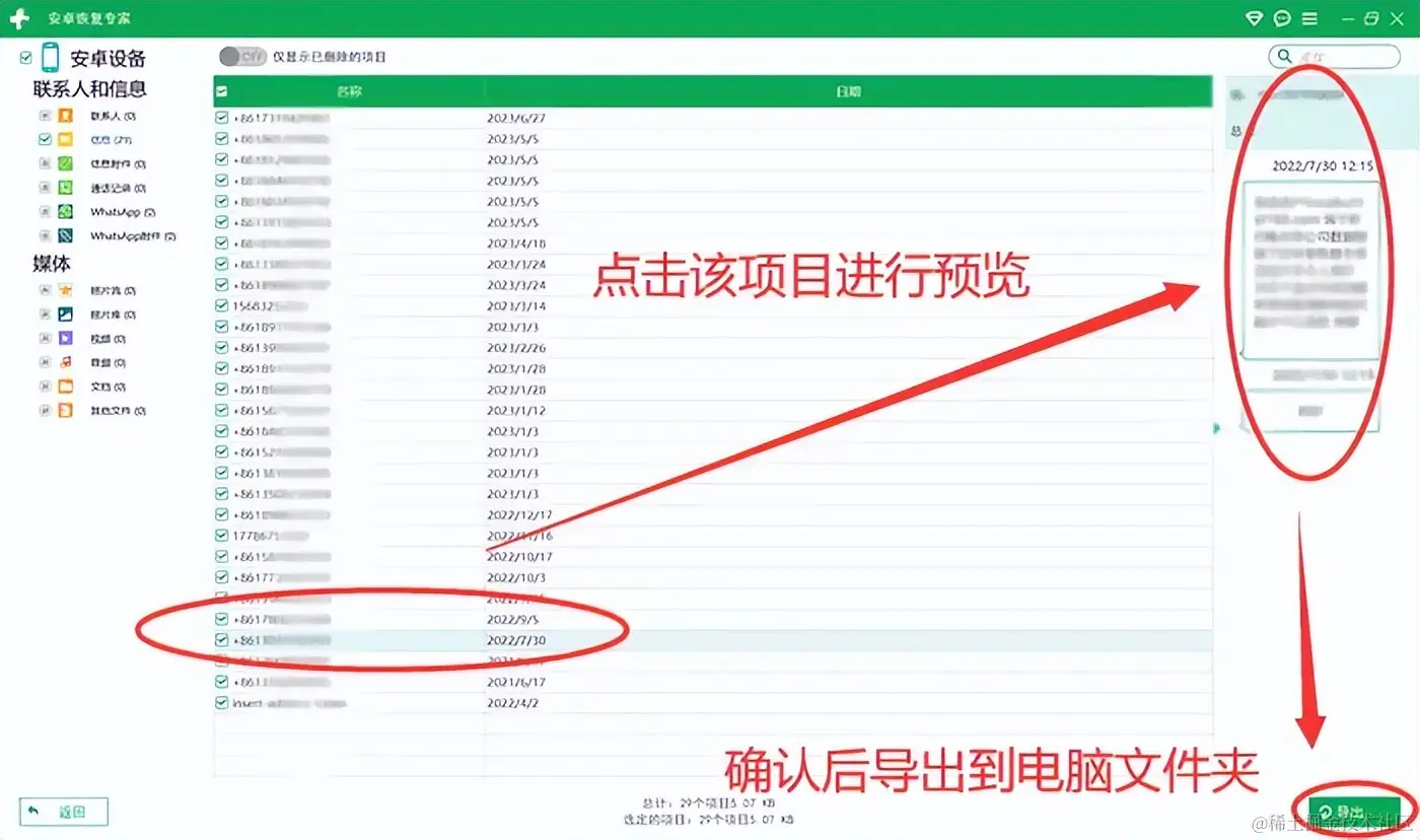 第三步:查看数据并恢复。扫描完成后,界面上将会显示所有可恢复的项目,我们可以通过搜索或筛选,确定需要找回的数据,然后点击 【导出】 即可下载到指定位置。