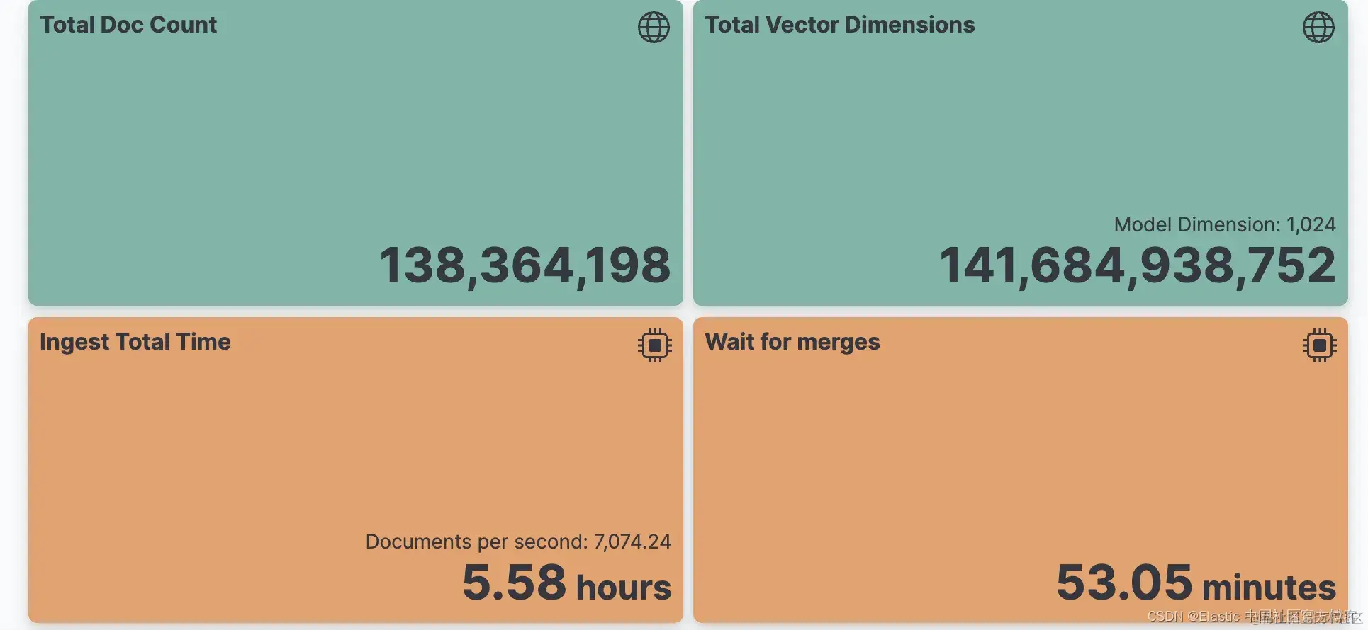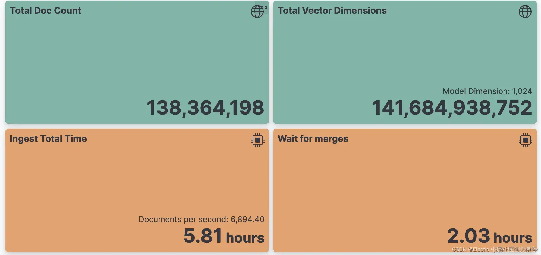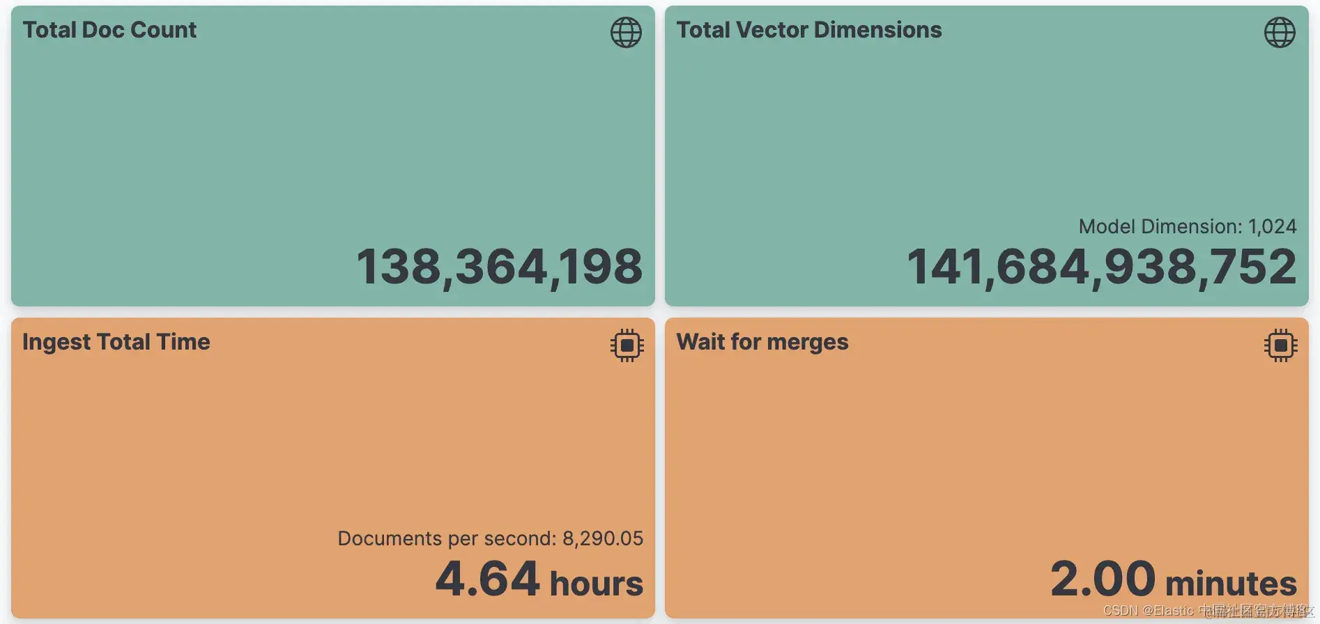 使用 Elasticsearch 8.14.0,138M 向量的初始索引花费了不到 5 个小时,平均每秒 8,000 个文档。
