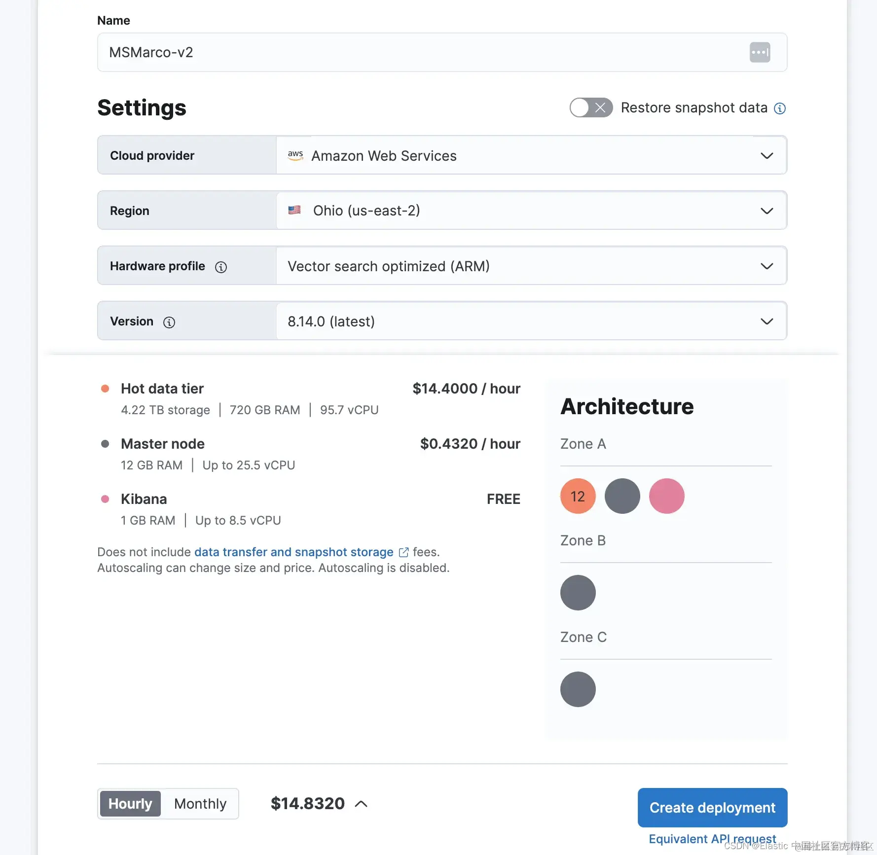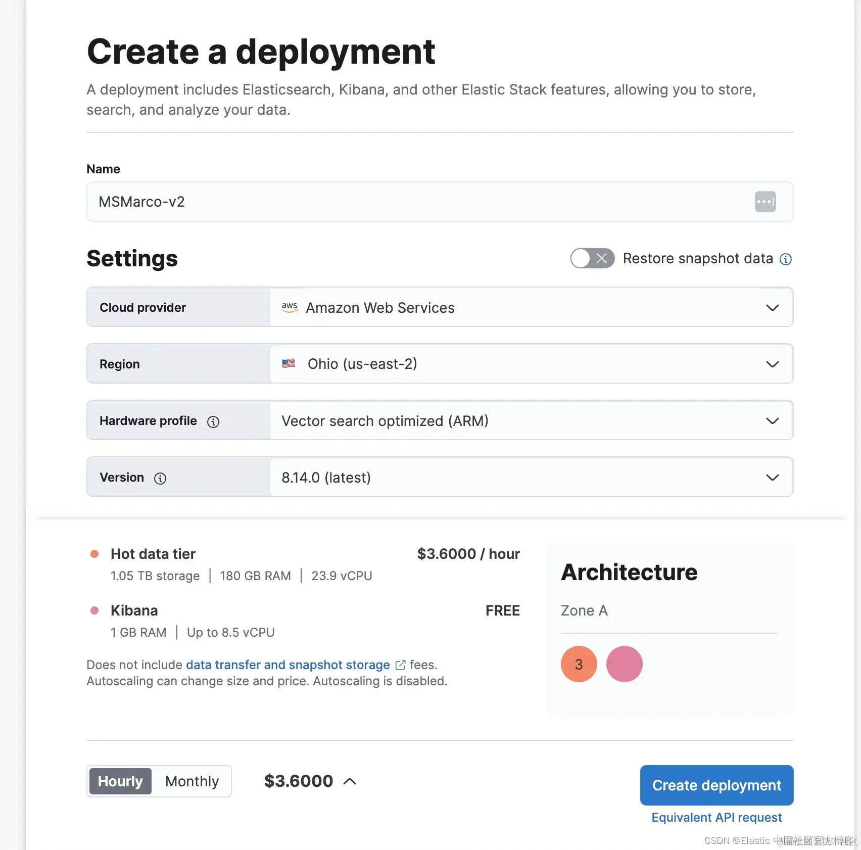 在撰写本博客时,此优化设置在 Elastic Cloud 上的总成本为每小时 3.60 美元(请注意,Azure 和 GCP 环境的价格会有所不同)