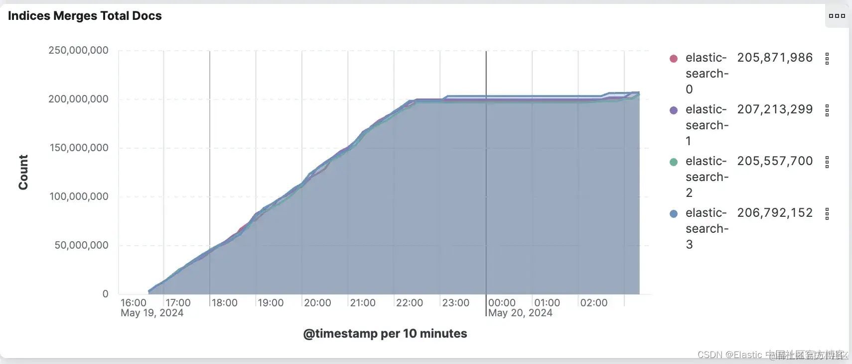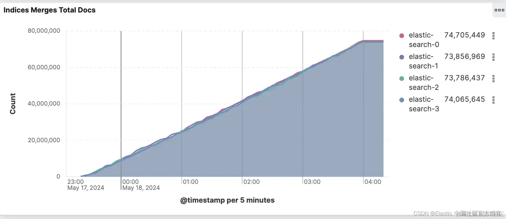 相比之下,在 Elasticsearch 8.13.4 上进行的相同实验需要近 6 个小时进行提取,另外还需要 2 个小时等待合并: