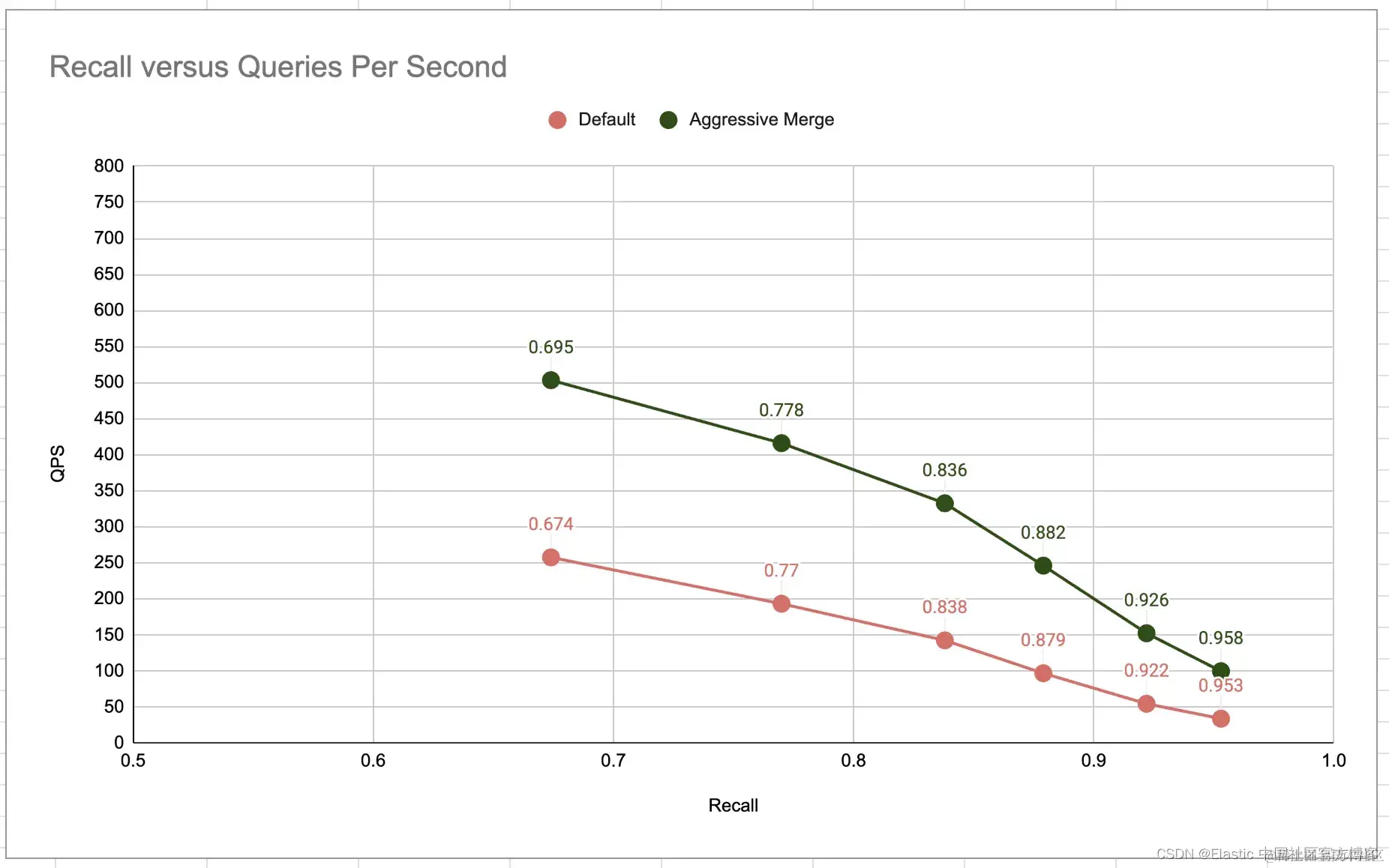 对于相同级别的召回率,激进合并配置的效率是后者的 2 到 3 倍。这种效率是意料之中的,因为搜索是在更大、更少的片段上进行的,如上一节所示。