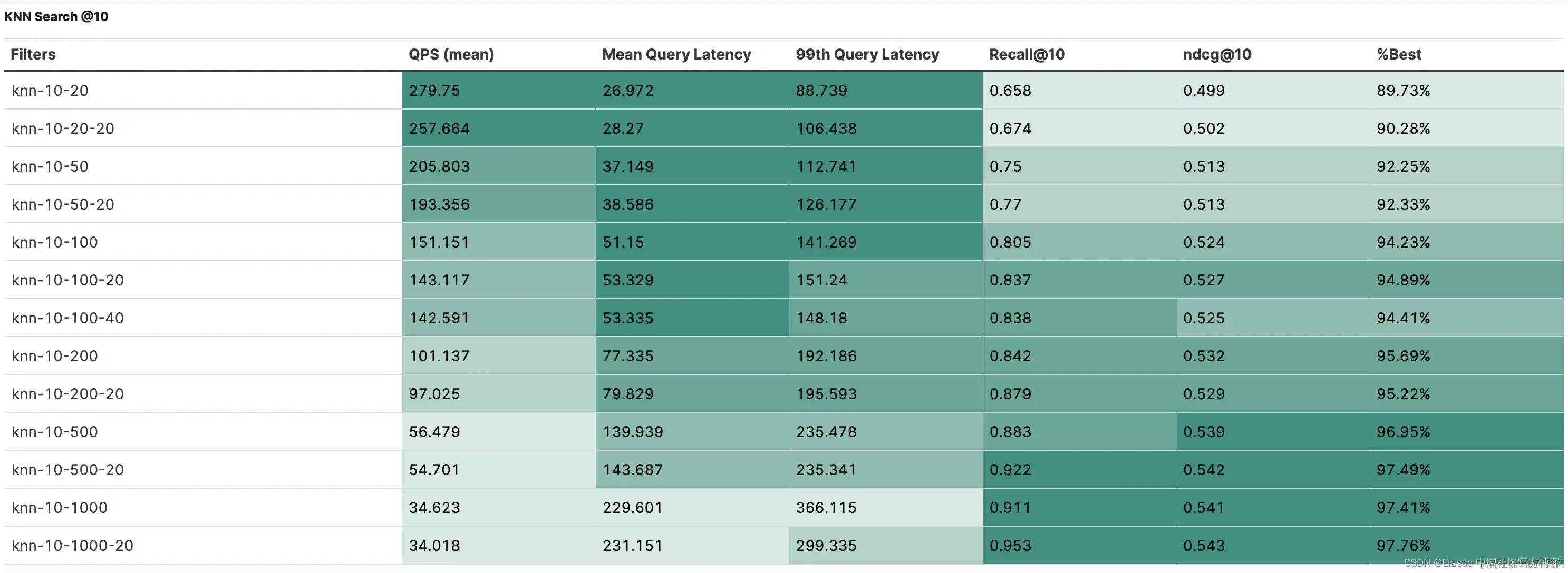 例如,我们观察到,尽管 knn-10-20-20 配置的召回率为 67.4%,但它实现了此数据集最佳可能 NDCG 的 90%。请注意,这只是一个点结果,结果可能因其他模型和/或数据集而异。