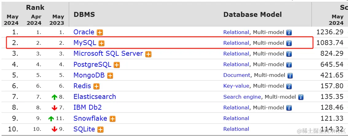 在数据库的世界里,MySQL作为一款广泛使用的关系型数据库管理系统。在DB-Engines的2024年5月的数据库管理系统流行度排名中得分1084,仅次于老大哥Oracle,足以MySQL在全球数据库市场中占有重要地位,当然MySQL在2009年被Oracle公司收购了。第一、第二都是Oracle公司的。