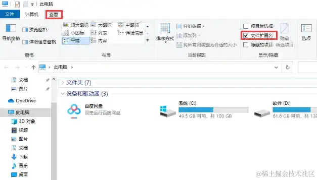 步骤1:双击打开**【此电脑】图标,在【查看】下勾选【文件扩展名】**,目的是方便查看和更改文件类型。