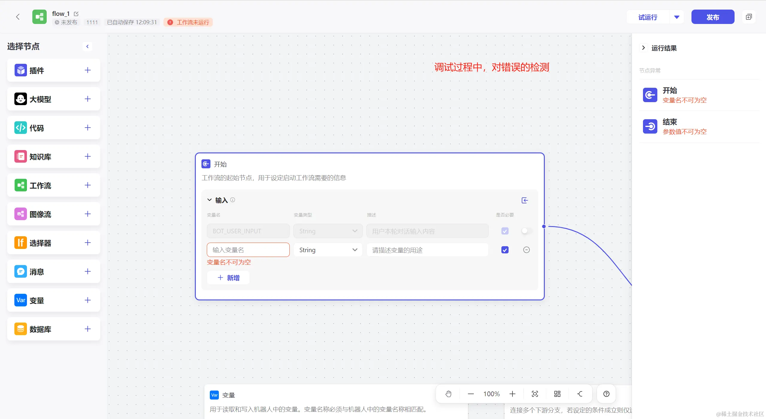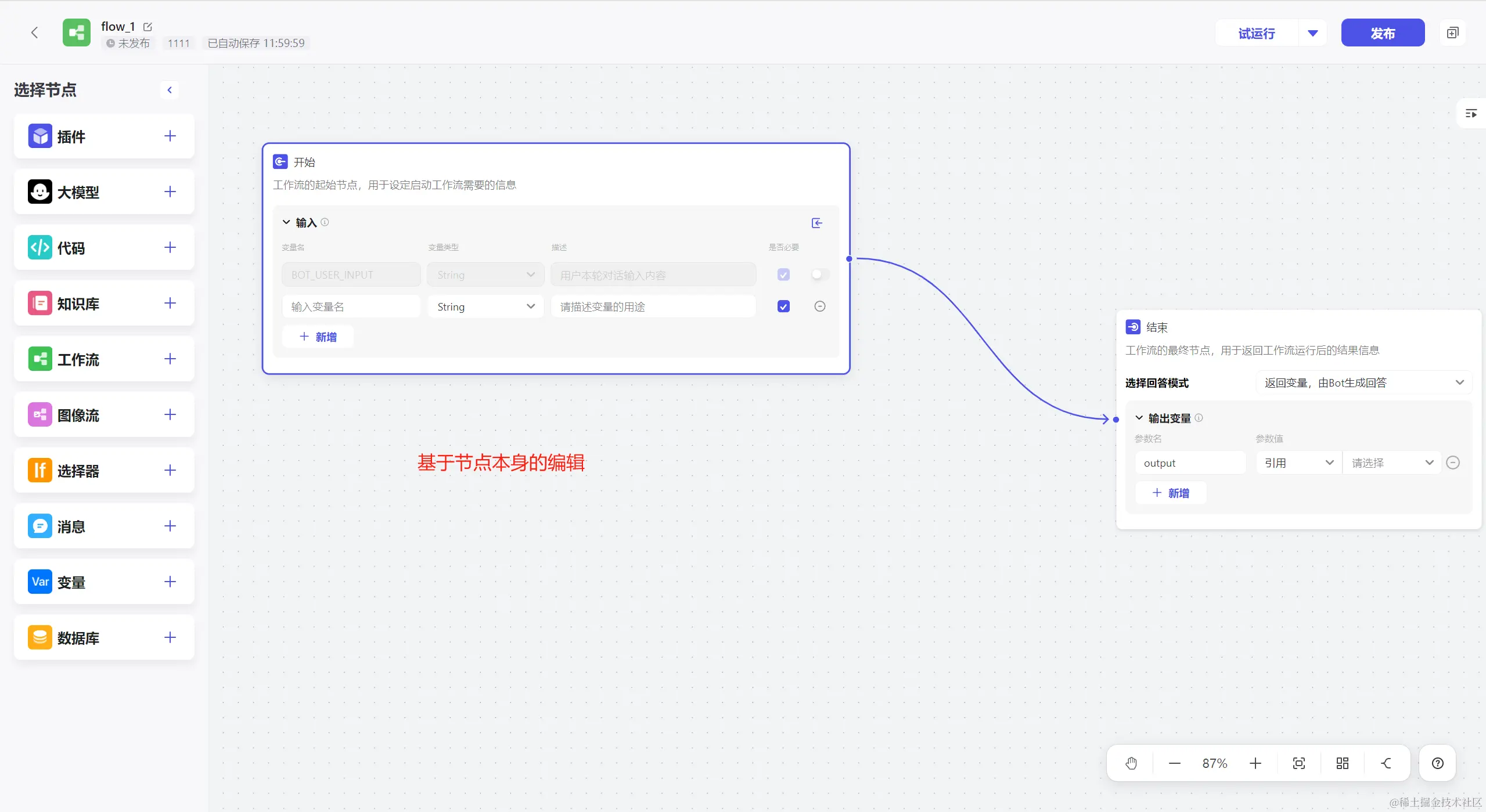 界面的简单直观,操作简单性,是服务编排的核心功能,界面上需要包括画布、原子服务的配置能力,目前主要有2大类方式,基于节点本身的配置,如扣子