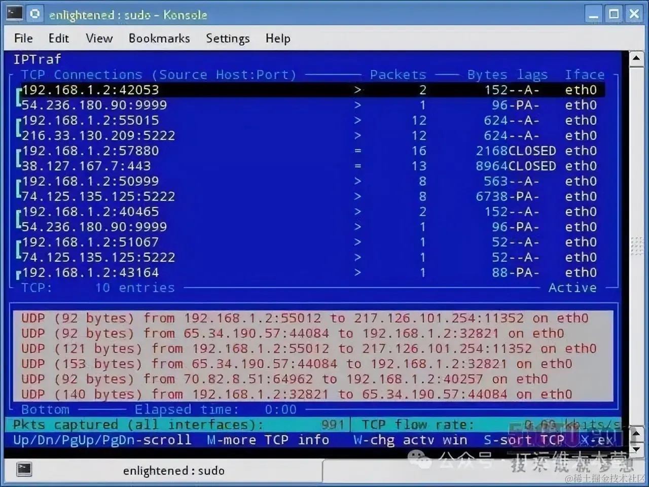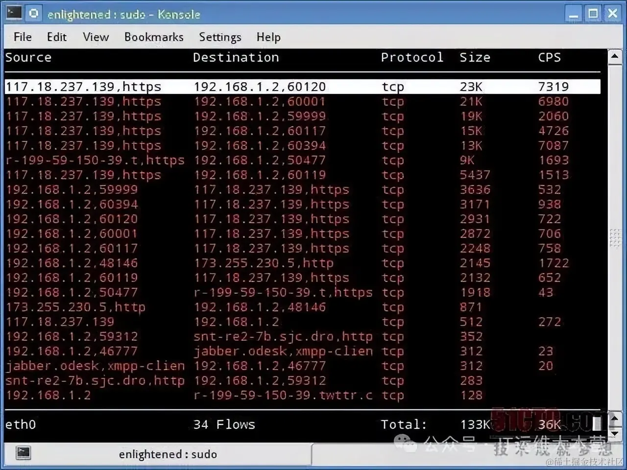 tcptrack类似iftop,使用pcap库来捕获数据包,并计算各种统计信息,比如每个连接所使用的带宽。它还支持标准的pcap过滤器,这些过滤器可用来监控特定的连接。