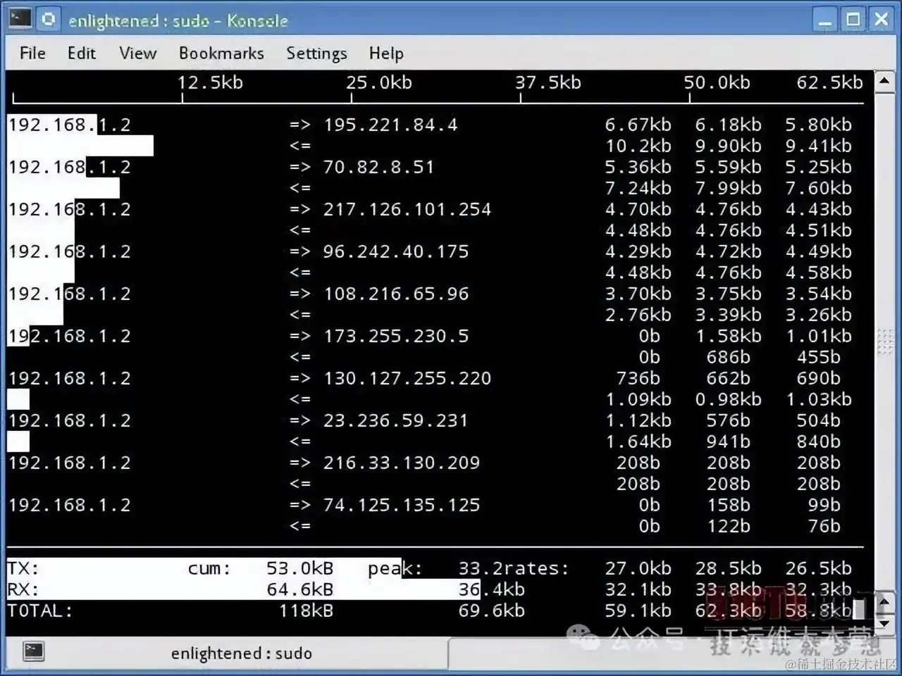 netwatch是netdiag工具库的一部分,它也可以显示本地主机与其他远程主机之间的连接,并显示哪些数据在每个连接上所传输的速度。