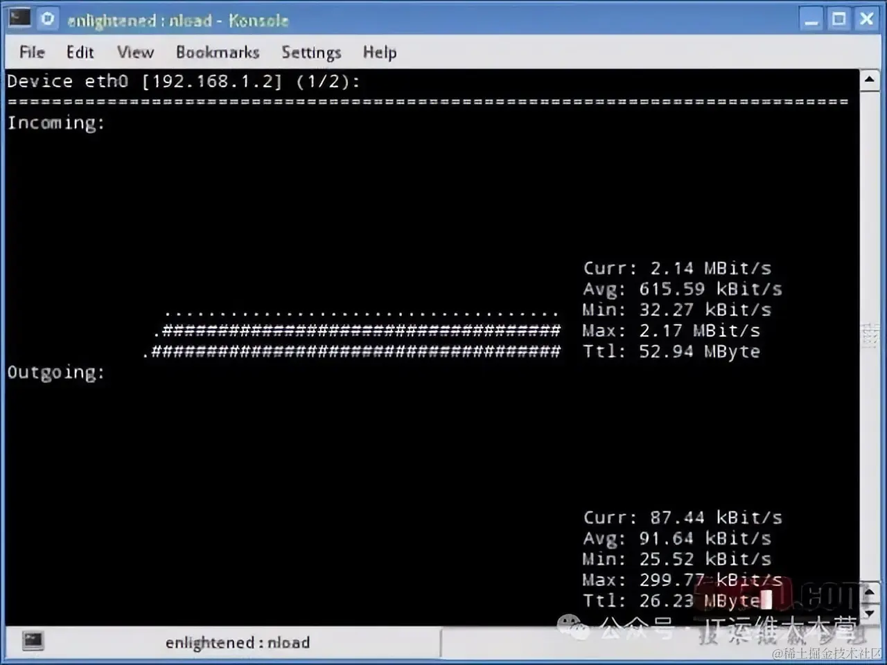 bwm-ng(下一代带宽监控器)是另一款非常简单的实时网络负载监控工具,可以报告摘要信息,显示进出系统上所有可用网络接口的不同数据的传输速度。