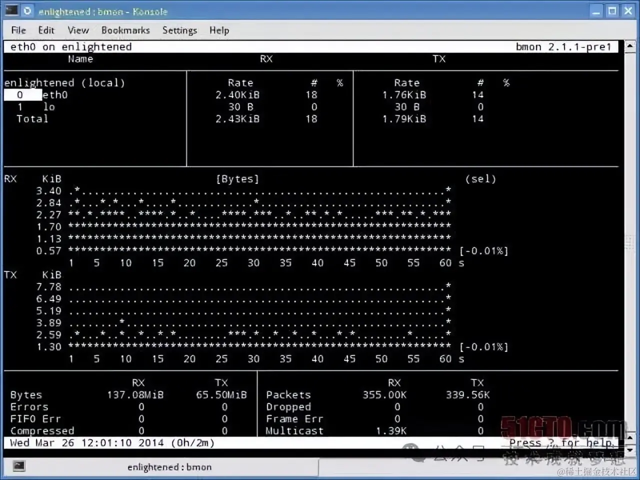 bmon(带宽监控器)是一款类似nload的工具,它可以显示系统上所有网络接口的流量负载。输出结果还含有图表和剖面,附有数据包层面的详细信息。