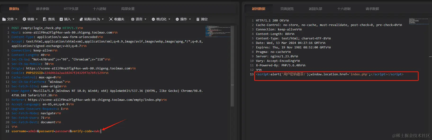 在并没有修改验证码的情况下,再次发送数据,可以看到右侧返回数据中显示成功发送数据,返回了 HTTP 为 200 的响应码,并且内容为“用户密码错误!”:
