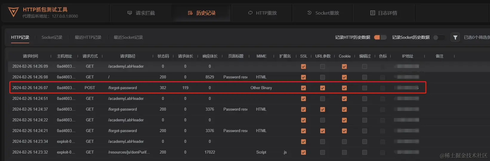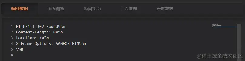 密码修改完成后会跳转到登录首页,回到 HTTP抓包测试工具,选择页面,查看刚刚发送的数据包,其中有一条 302 跳转的数据包值得观察: