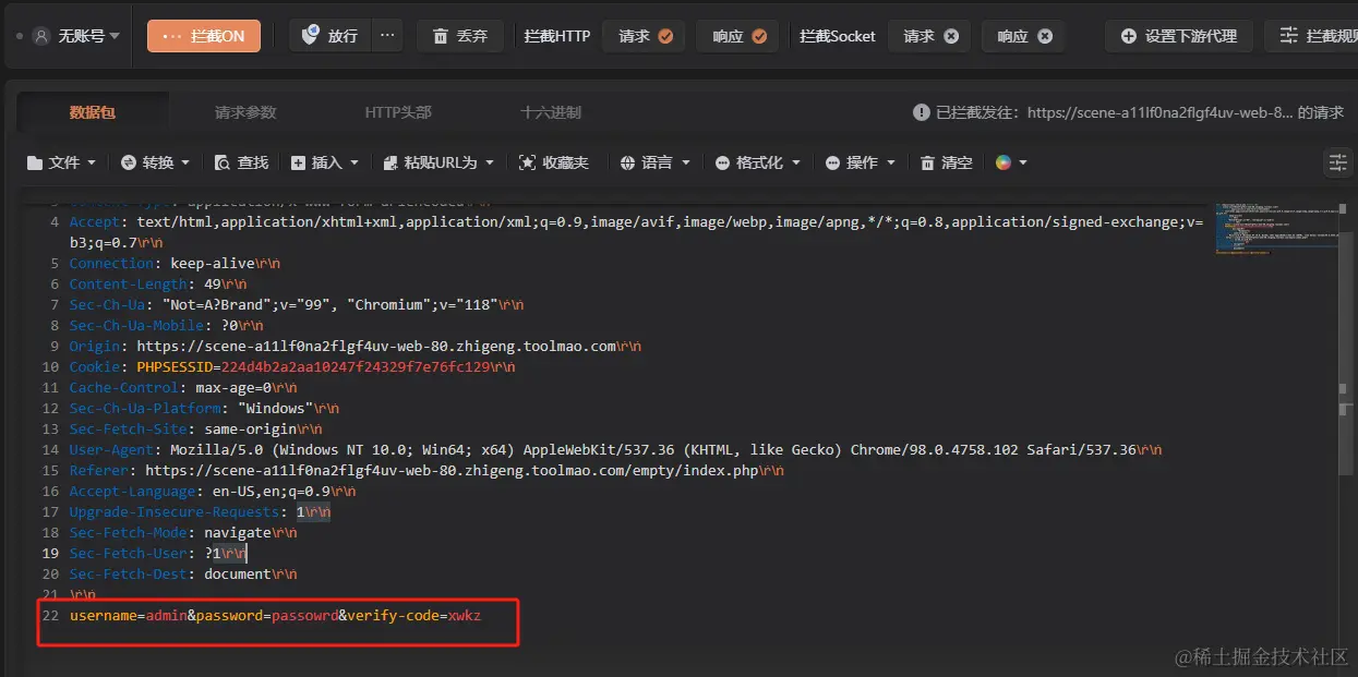 在 HTTP抓包测试工具中,打开左上角拦截开关拦截数据,输入任意的账号(admin)、密码还有验证码,点击登录: